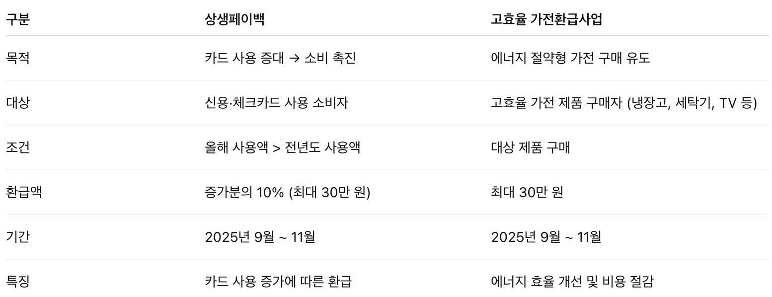 아래에 상생페이백과 고효율 가전환급사업에 대해 표로 정리해보았습니다.